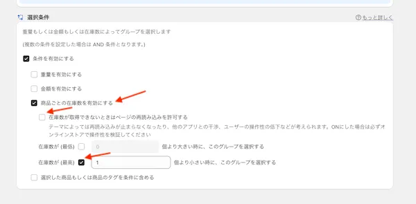 商品の在庫数を条件としてグループを選択することができます。